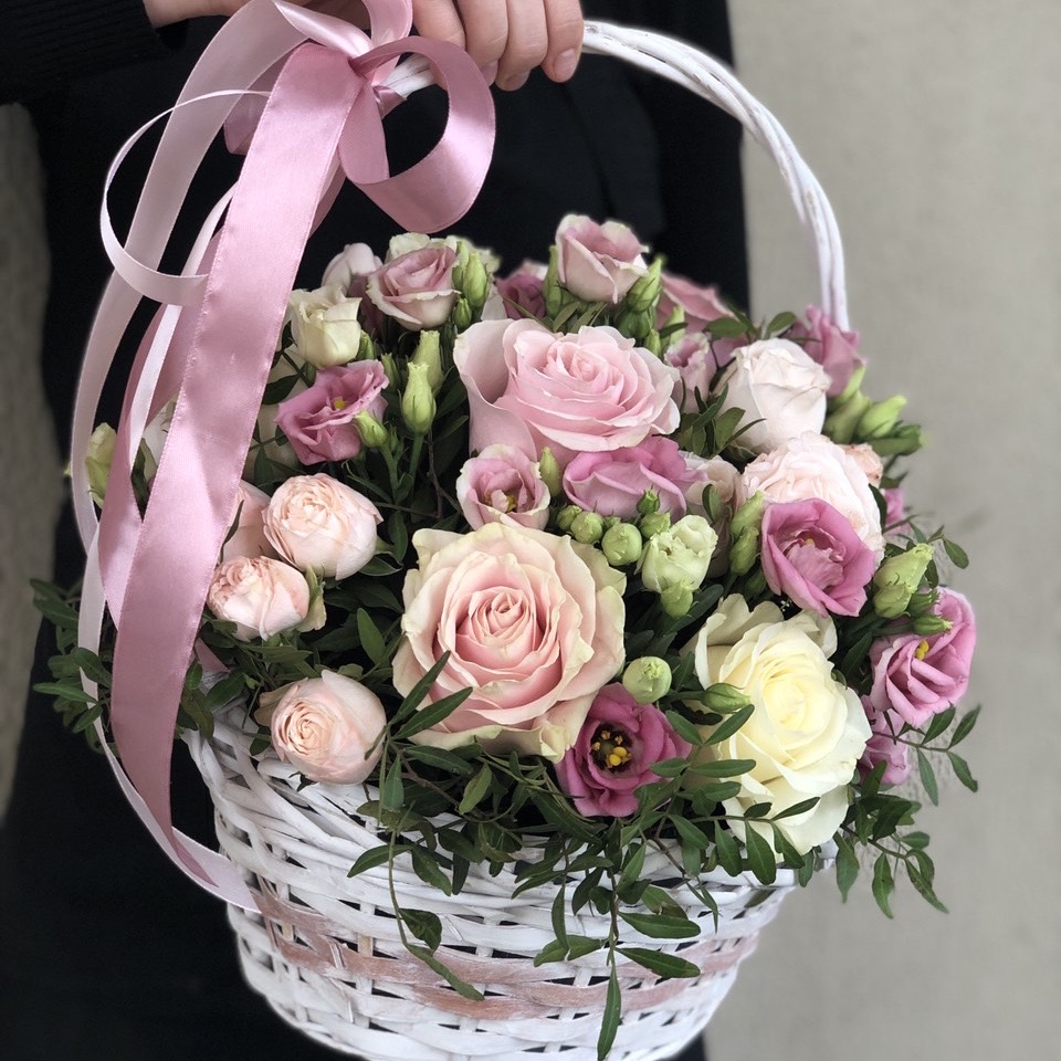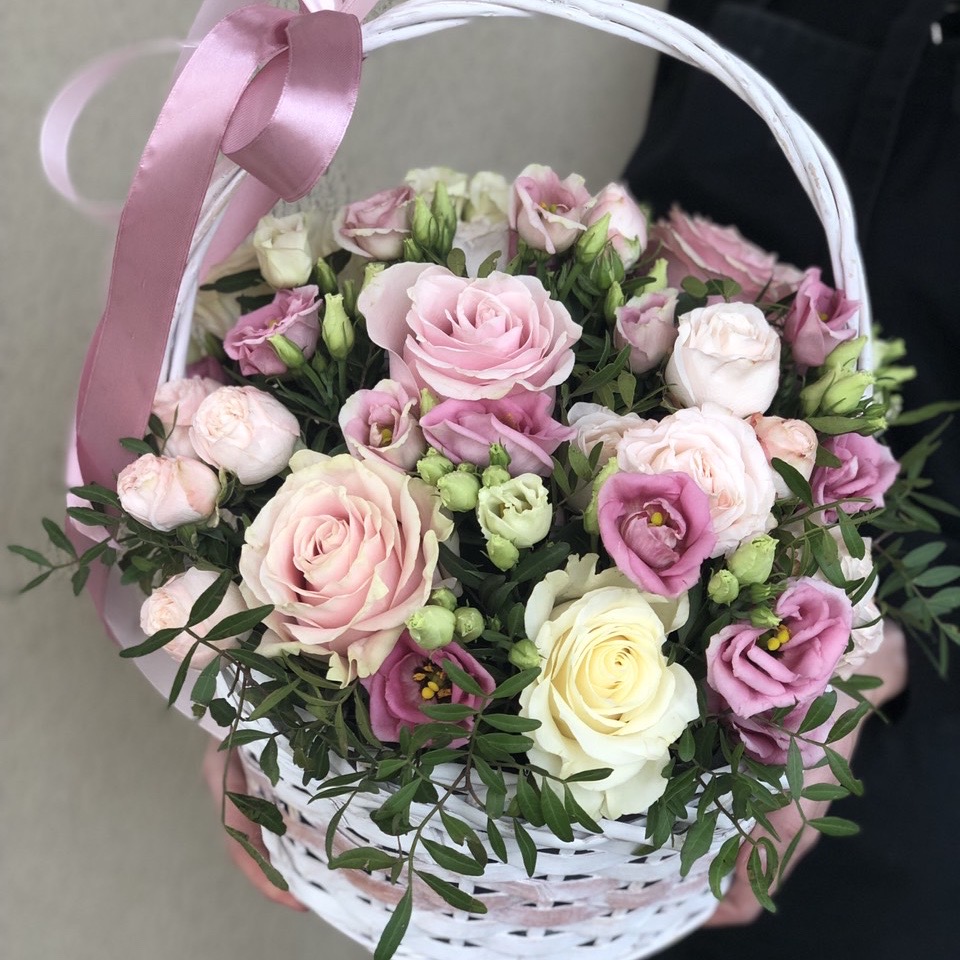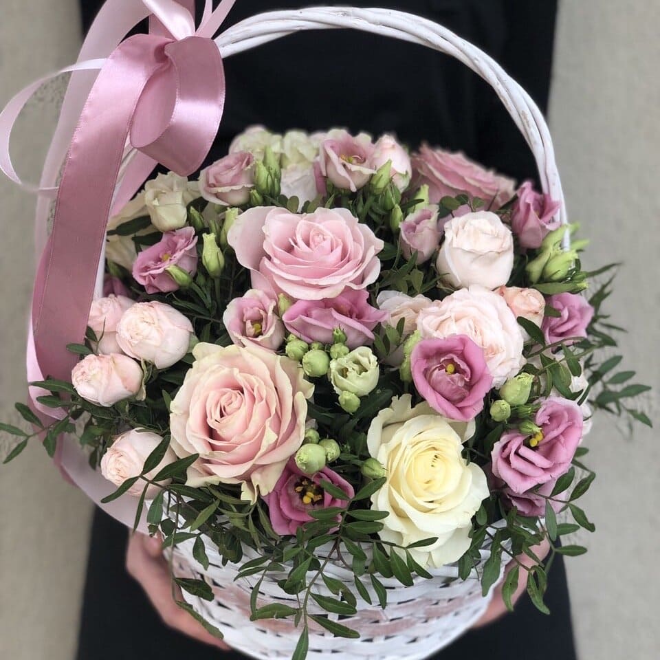 Состав: Роза одноголовая (5), Эустома (6), Кустовая роза (5), Писташ (4), Корзина, Оазис (4), Оформление