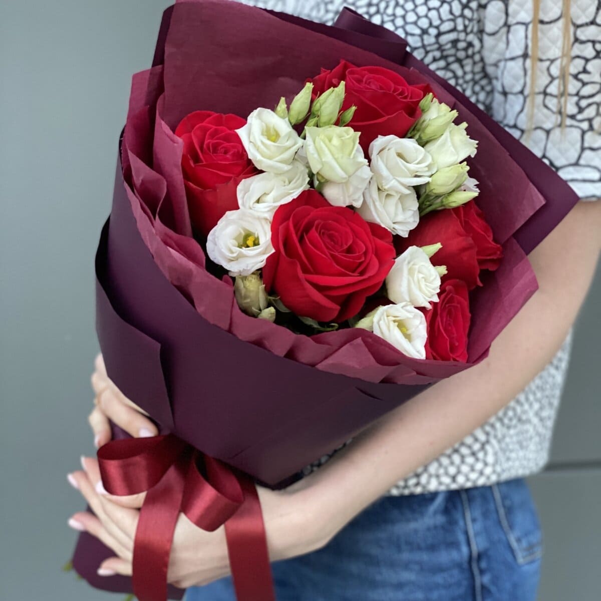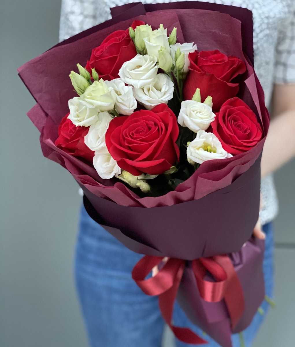 Чарующий букет из белой эустомы и ярко бордовой розы, подарок для действительно яркой особы! Цветочная композиция которая действительно передаст все пылкие чувства, о которых сложно сказать словами.