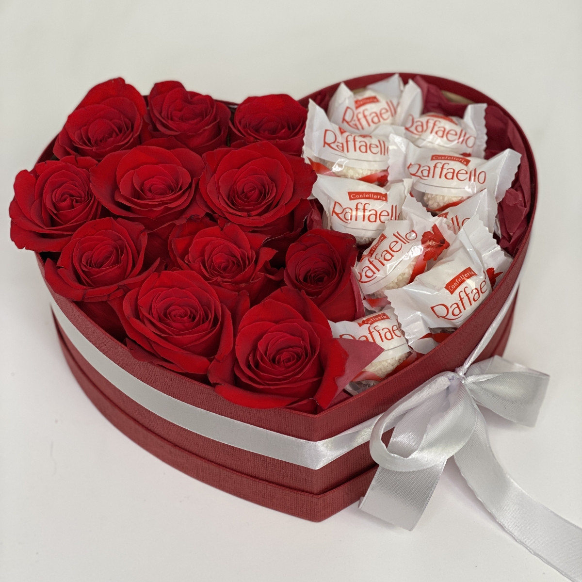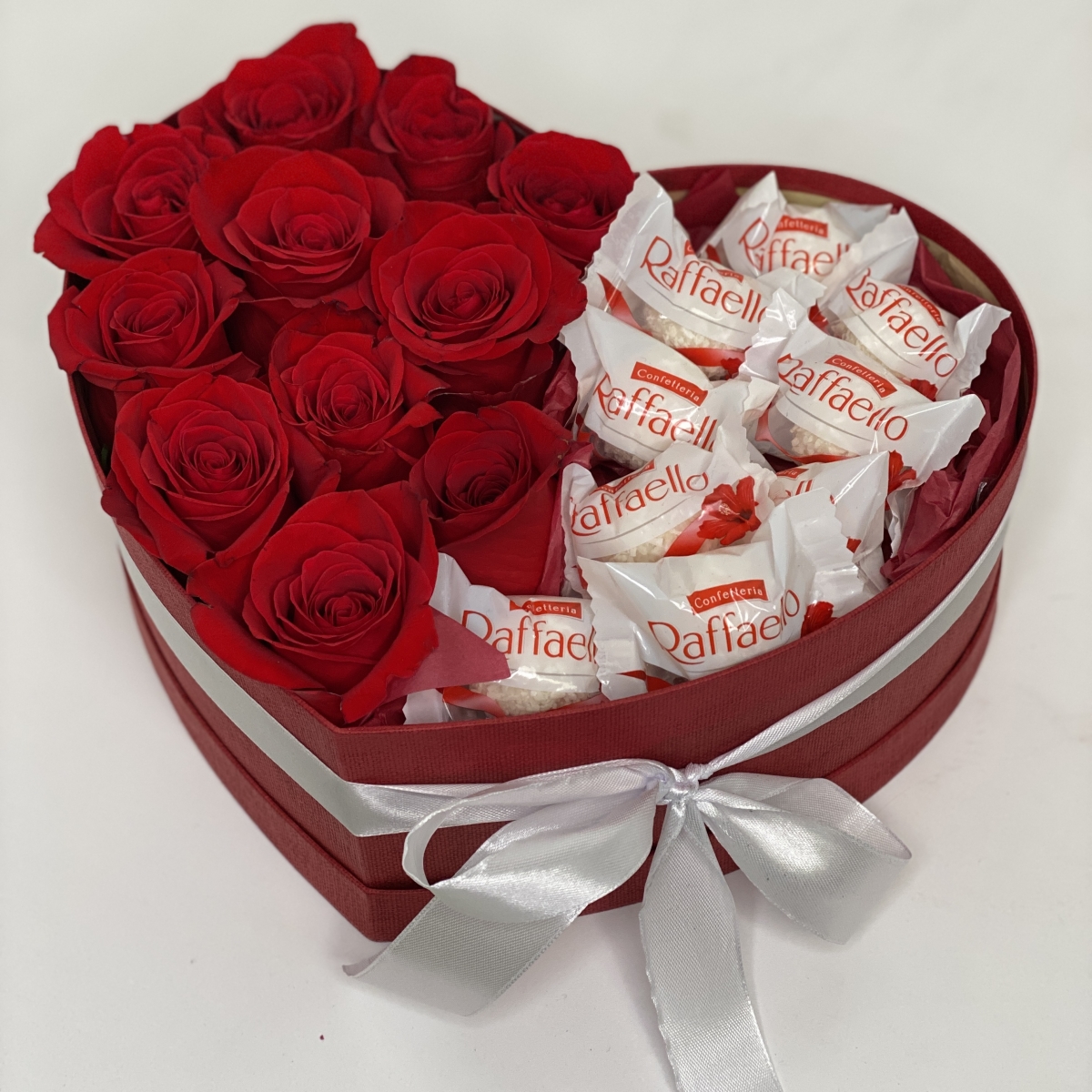 Состав: Роза красная (11), Конфеты Раффаэло, Коробка (1), Оазис (2)
