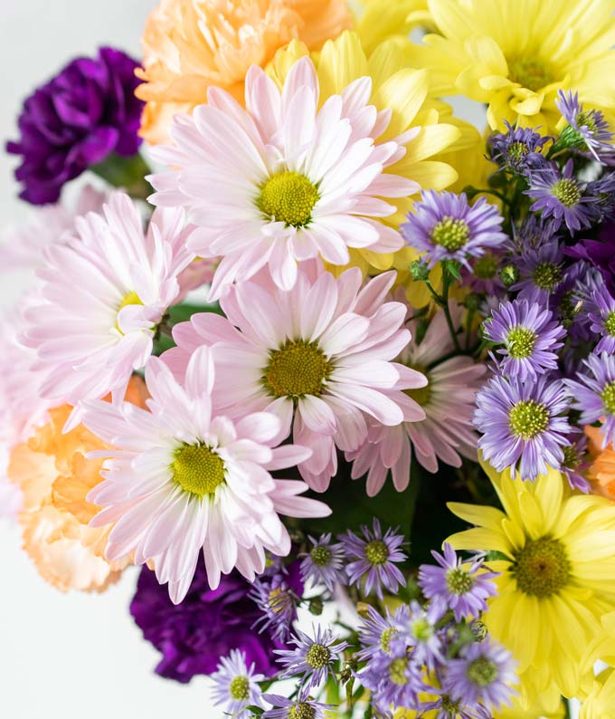 Хризантема (4), Эустома (5), Синяя ромашка (1)