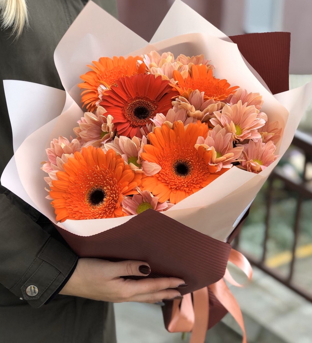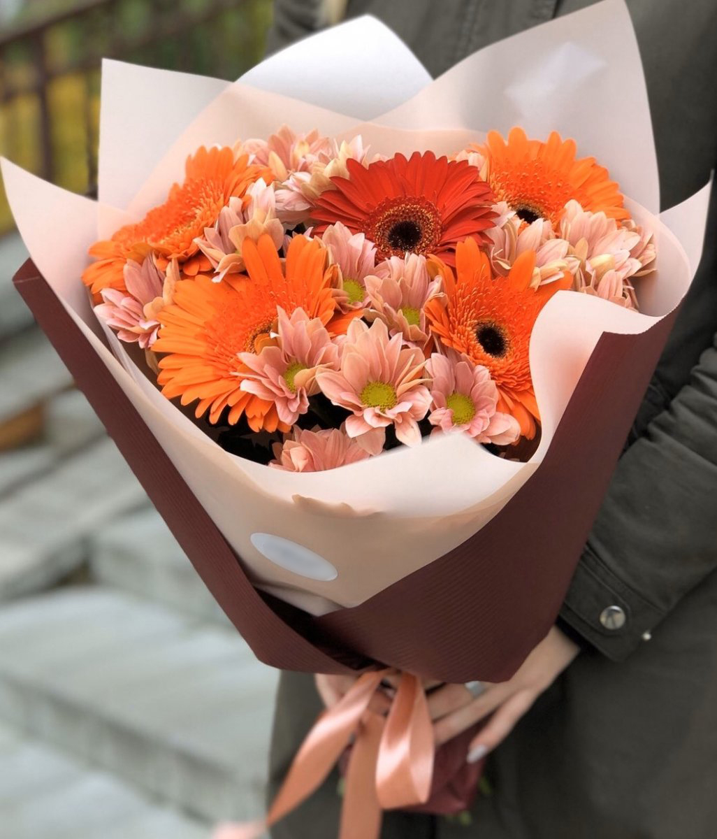 Состав: Хризантема (3), Гербера (5), Оформление (1)