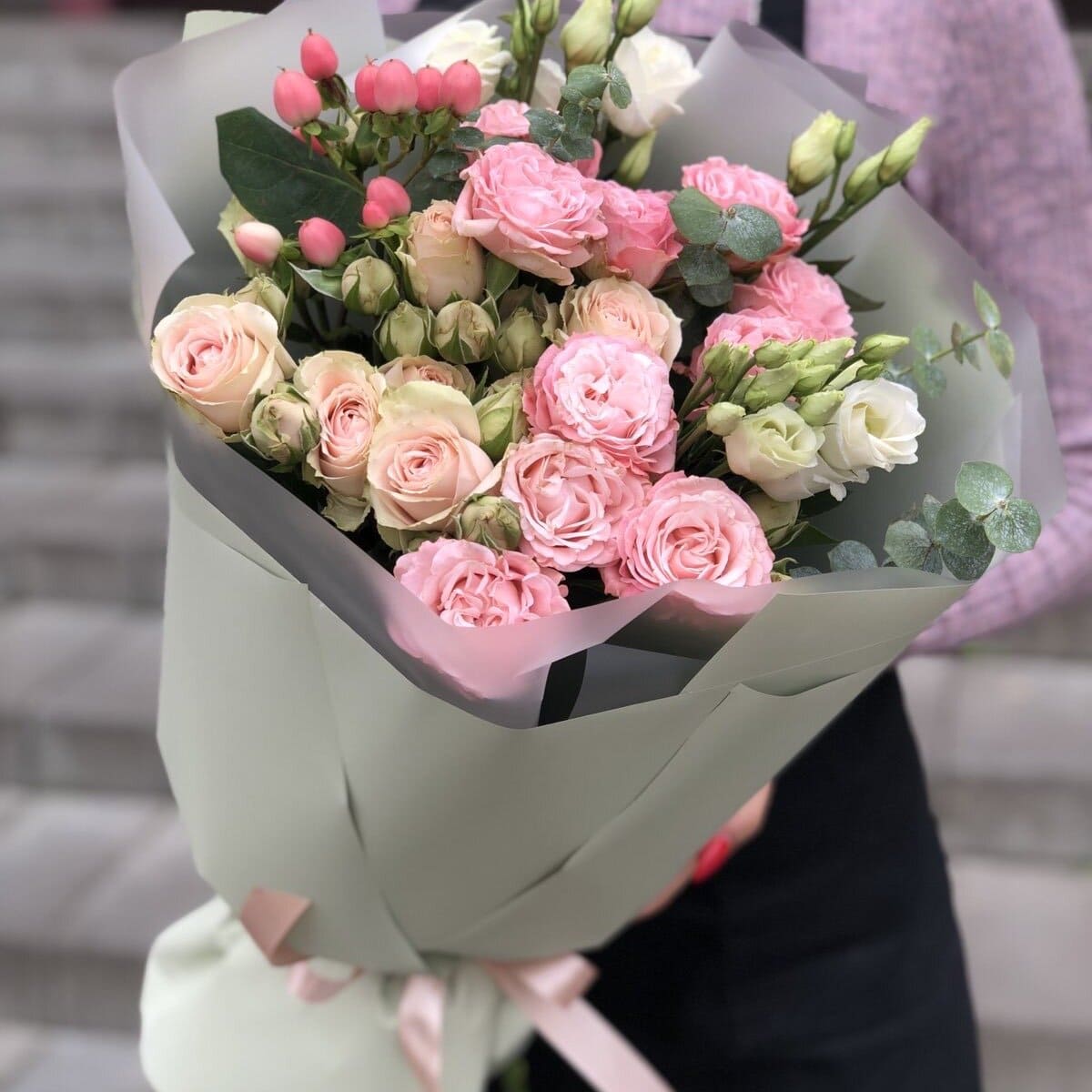 Состав: Эустома (3), Эвкалипт (1), Кустовая роза (4), Оформление (1).