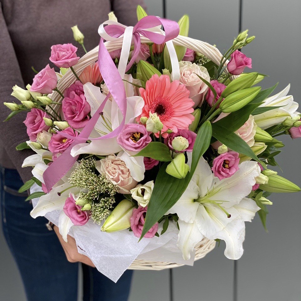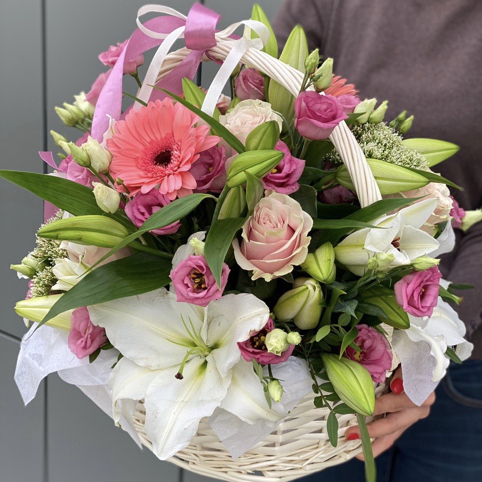 Состав: Эустома (7), Трахелиум (4), Роза розовая (8), Писташ (6), Лилия (5) Гербера (3), Корзина (1), Оазис (3)