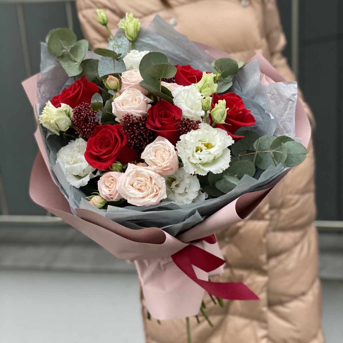 Состав: Гипсофила (1), Роза красная (5) 60 см, Кустовая роза (2), Эвкалипт (2), Эустома (2), Писташ (1), Оформление