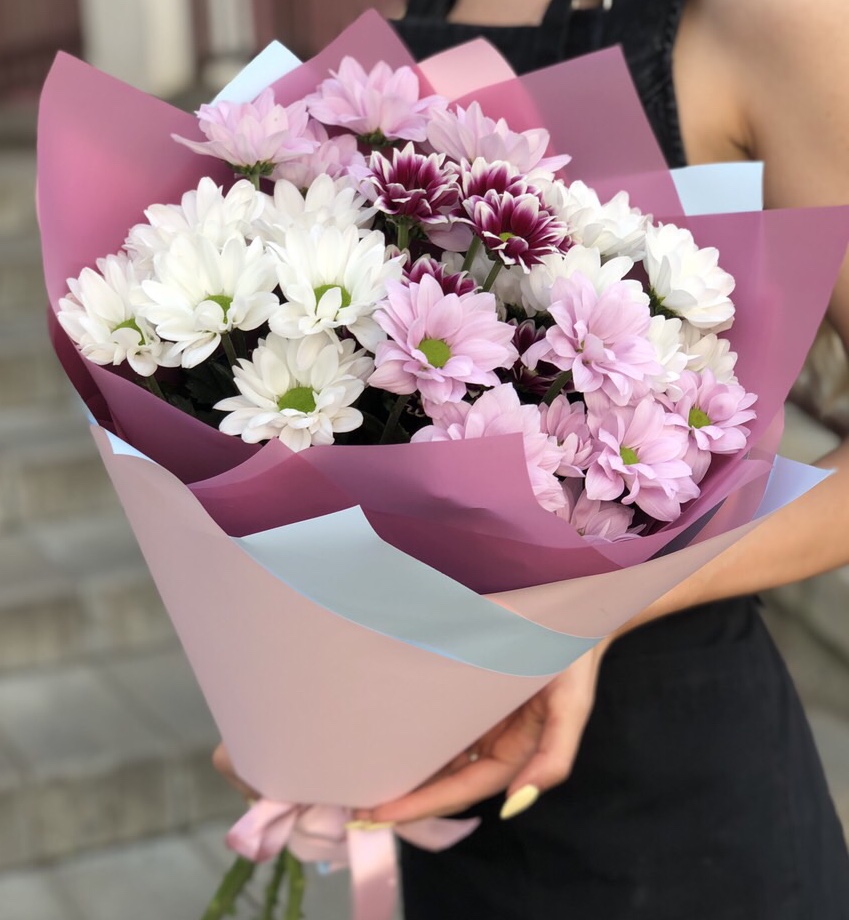 Букет в котором все цветы как на подбор, классическая белая хризантема дополнена розовой с сиреневой. Цветы выглядят необычайно изящно и в то же время ярко!