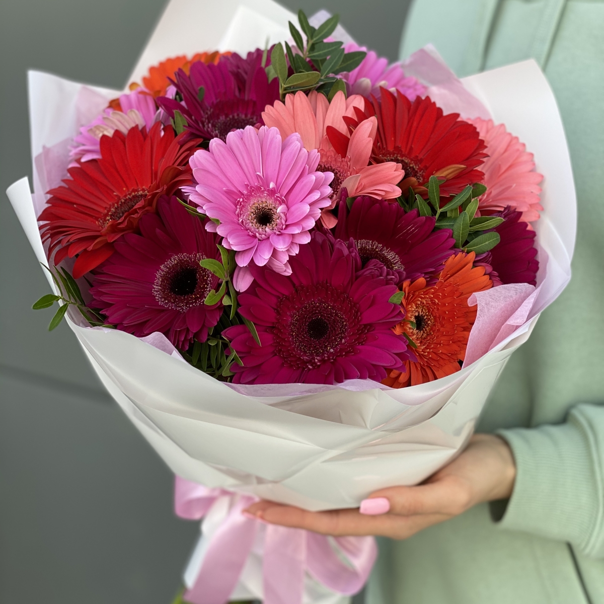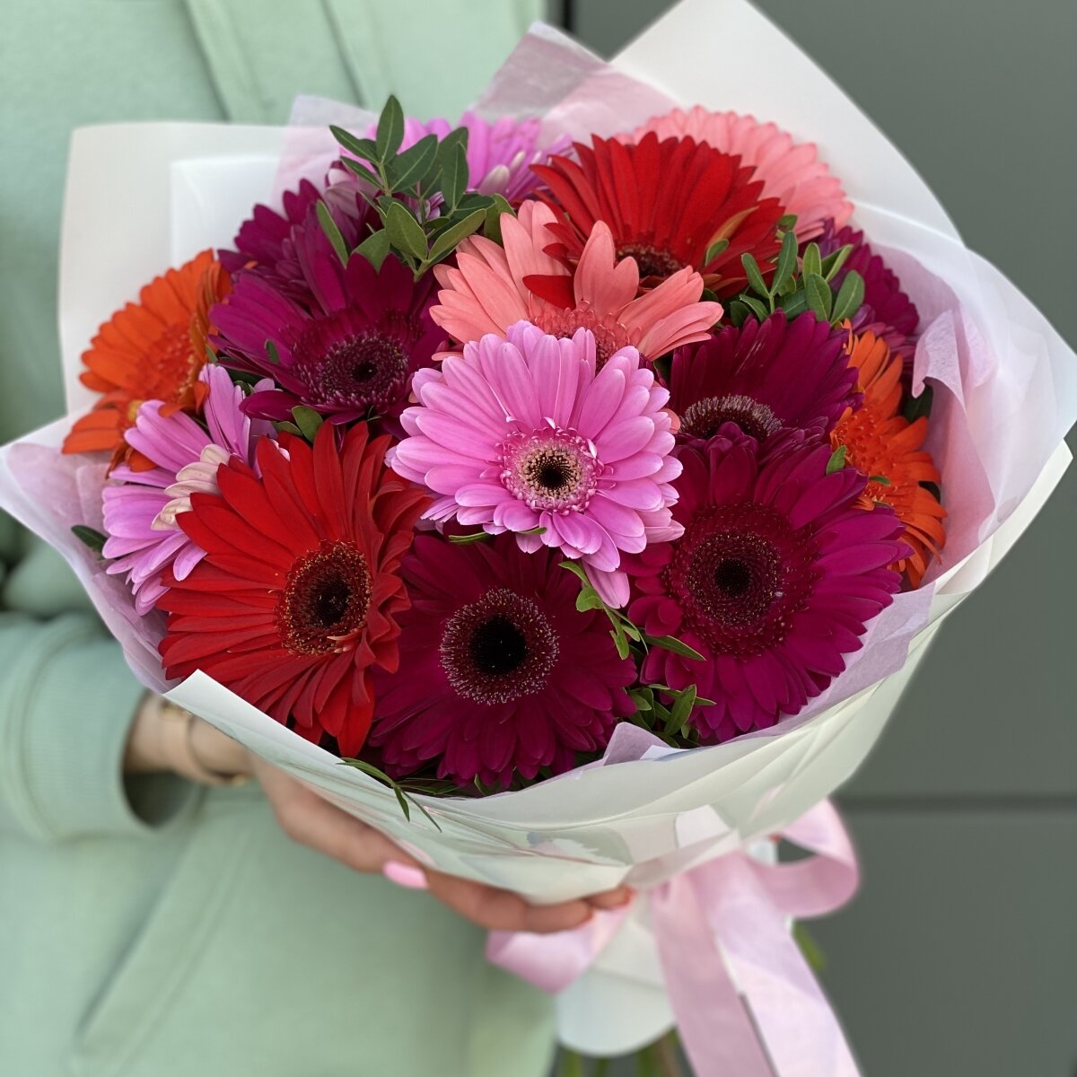 Чудо букет из насыщенных гербер с зеленью, в котором нет ничего лишнего. Такой букет принято держать в руках и дарить своей возлюбленной, даже если находишься на расстоянии можно порадовать близкого человека позвонив нам. Мы всегда готовы осуществить ваш сюрприз.