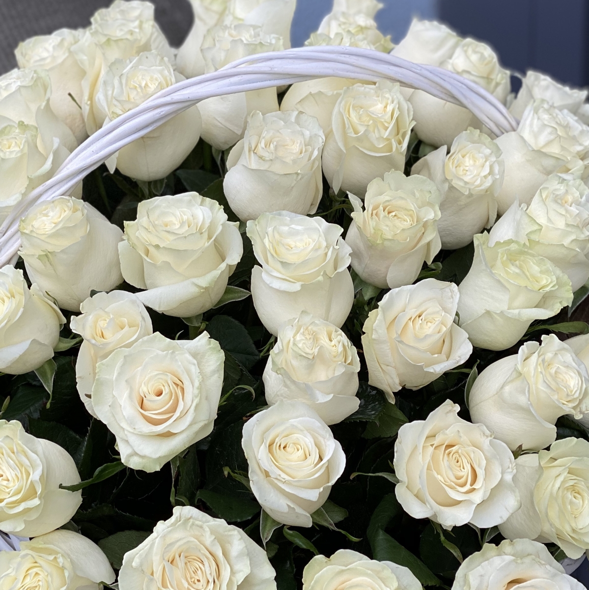 Неимоверное колличество белых роз собраны в одну композицию, бережно оформлены флористом в легкую плетёную корзину. Однозначно вызовут искренние эмоции у милого вашему сердцу человека!