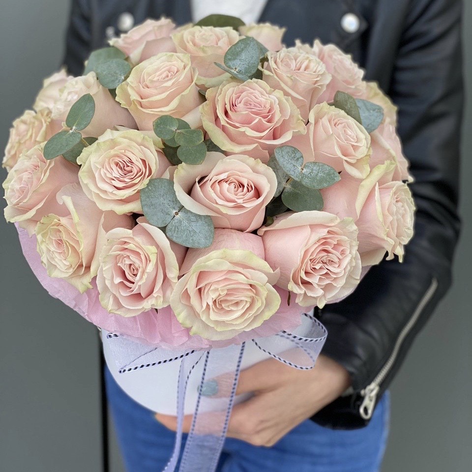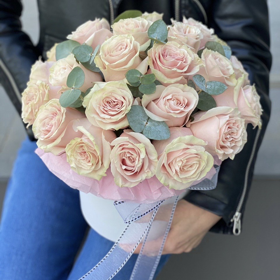 Состав: Роза розовая (25), Коробка (1), Оазис (2), Эвкалипт (1), Оформление