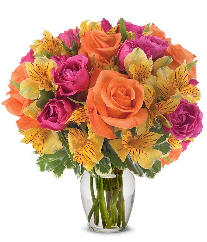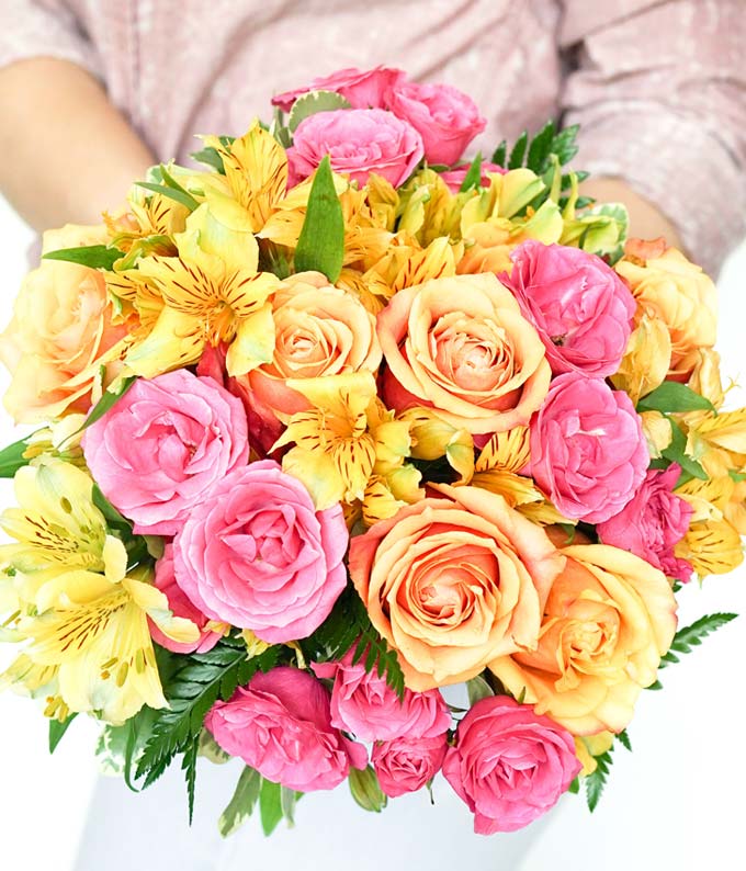 Удивительно яркий букет из альстромерии ярко жёлтого цвета, кустовой розы нежного розового оттенка и сочных бутонов оранжевой розы. Букет как летний солнечный день поднимет настроение с первого взгляда.